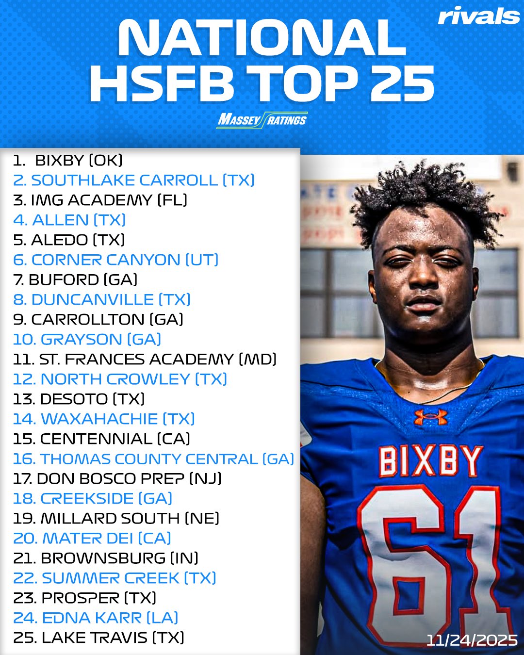 Bixby #1 been there all year. These schools will have tons of college coaches attending games (and have already). 10 of 25 from texas. 5 from Georgia.