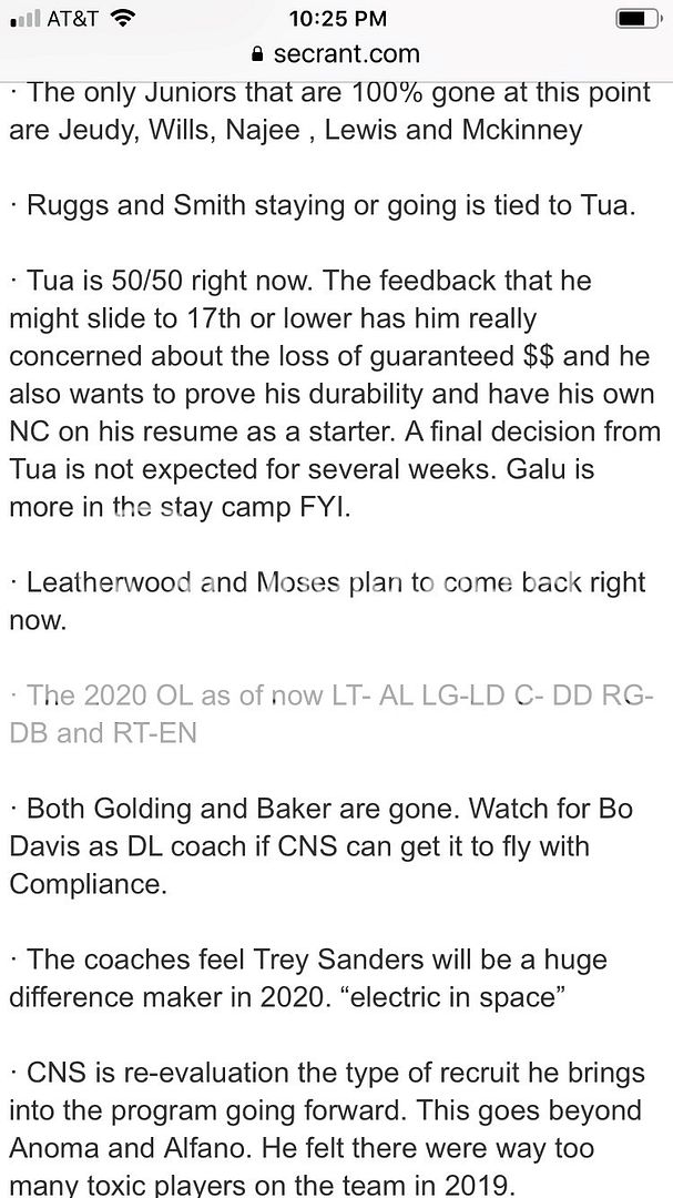 I can add that Tua has narrowed it down to two firms to represent him. That doesn’t mean he is leaving for sure.. but he or Dad is getting ducks in a row Incase. They are getting high grades coming in.. I still think it would be a risk.. but I hope he goes high and doesn’t jump and fall to the second round or late first.