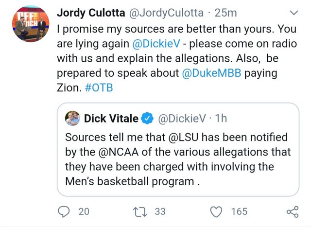 LSU senior associate athletic director Robert Munson later told The Advocate that, "LSU has not received any notice of allegations involving the men's basketball program or any athletic program at LSU."