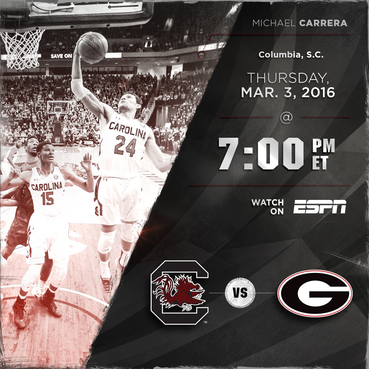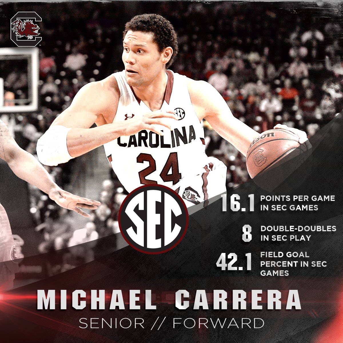 #Gamecocks senior forward Michael Carrera is unavailable for today's game at Arkansas due to a right hip injury, he is listed as day-to-day