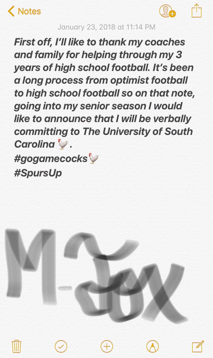Fox chose South Carolina over other offers from Auburn, Florida, Georgia, Louisville, Miami, and others.