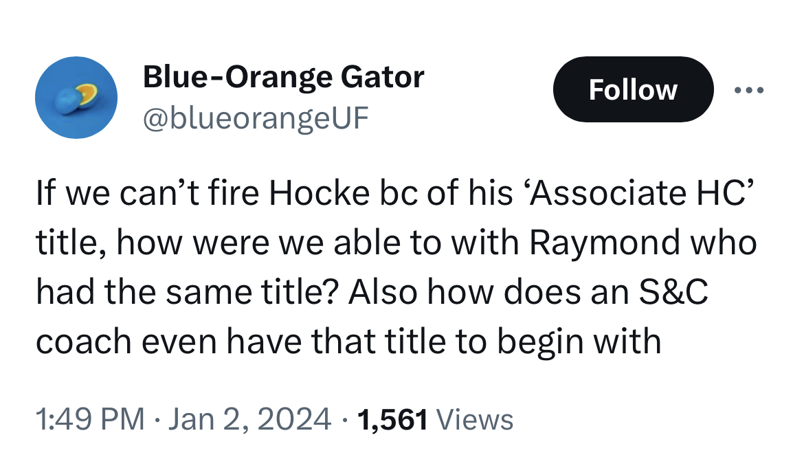 I am a firm believer that UF has too much potential and too many people who care to waddle in mediocrity for too long. One thing you do have to give our admin credit for (sorry theCAW) is that we have cut bait on hires that aren't working out pretty quickly.