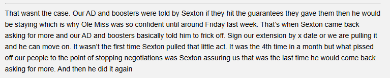 He signs or he doesn’t coach again, nobody seems to have a firm date though. I’ve heard this Friday, Sunday, and all the way until Thursday afternoon. OM boosters and KC are sick of this shite and done playing games with Sexton. There are contingencies in place already.