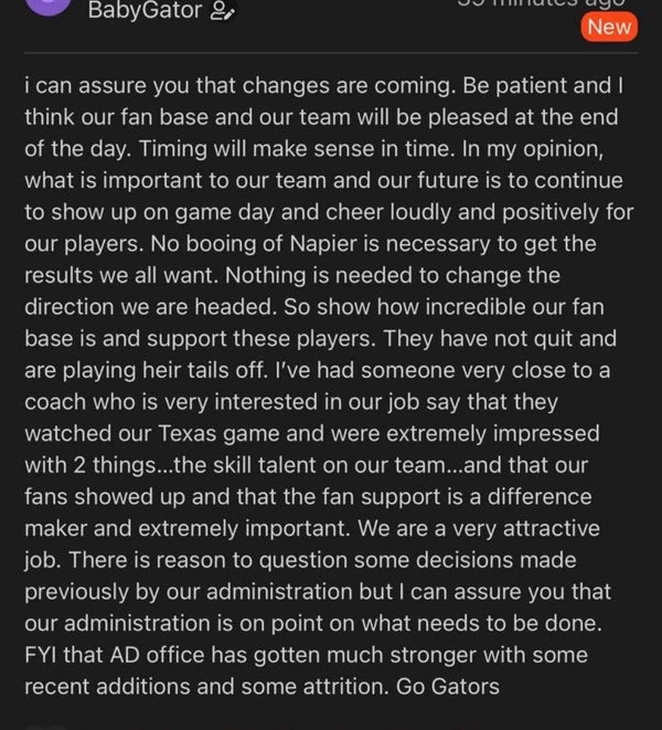 Y’all can dream on, kiffin will not leave ole miss for UF, on the flip side I don’t know if the powers that be at UF will even consider him.