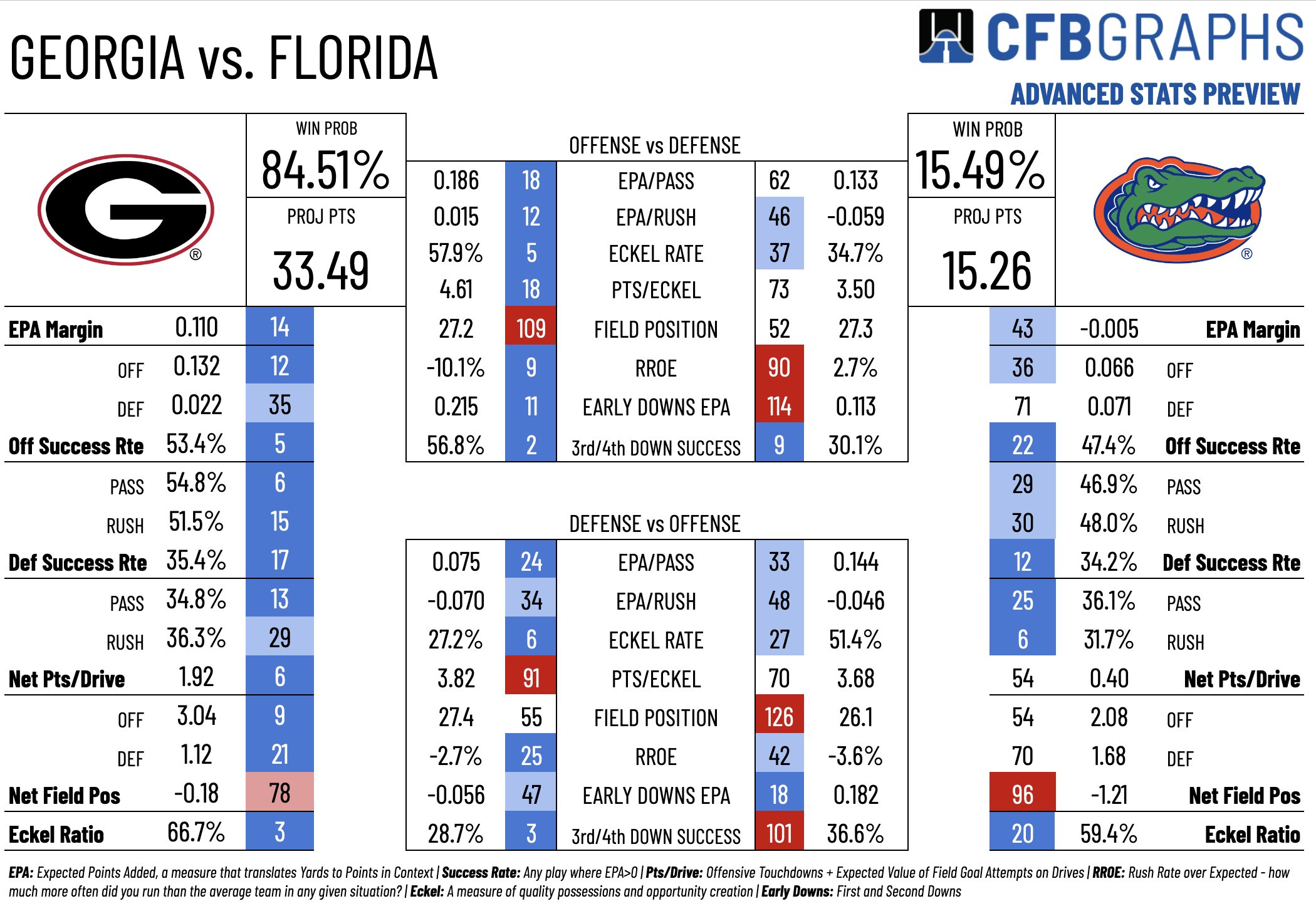 I see Florida struggling on 3rd down and UGA not allowing Florida to more then 80 yards rushing for the game.