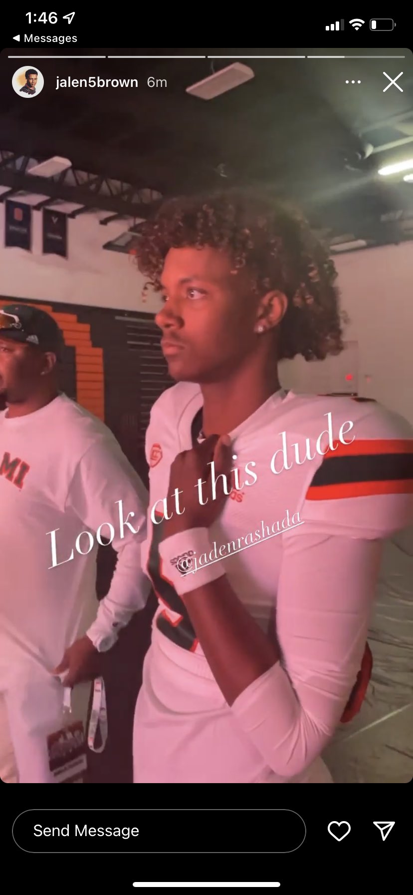 Miami Gulliver Prep five-star wide receiver Jalen Brown is back at Miami on Wednesday. The local pass catcher posted a picture on social media of Top247 quarterback Jaden Rashada dressed up in a Miami uniform ready for his photoshoot.