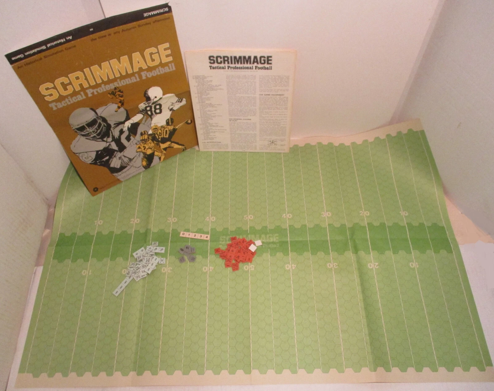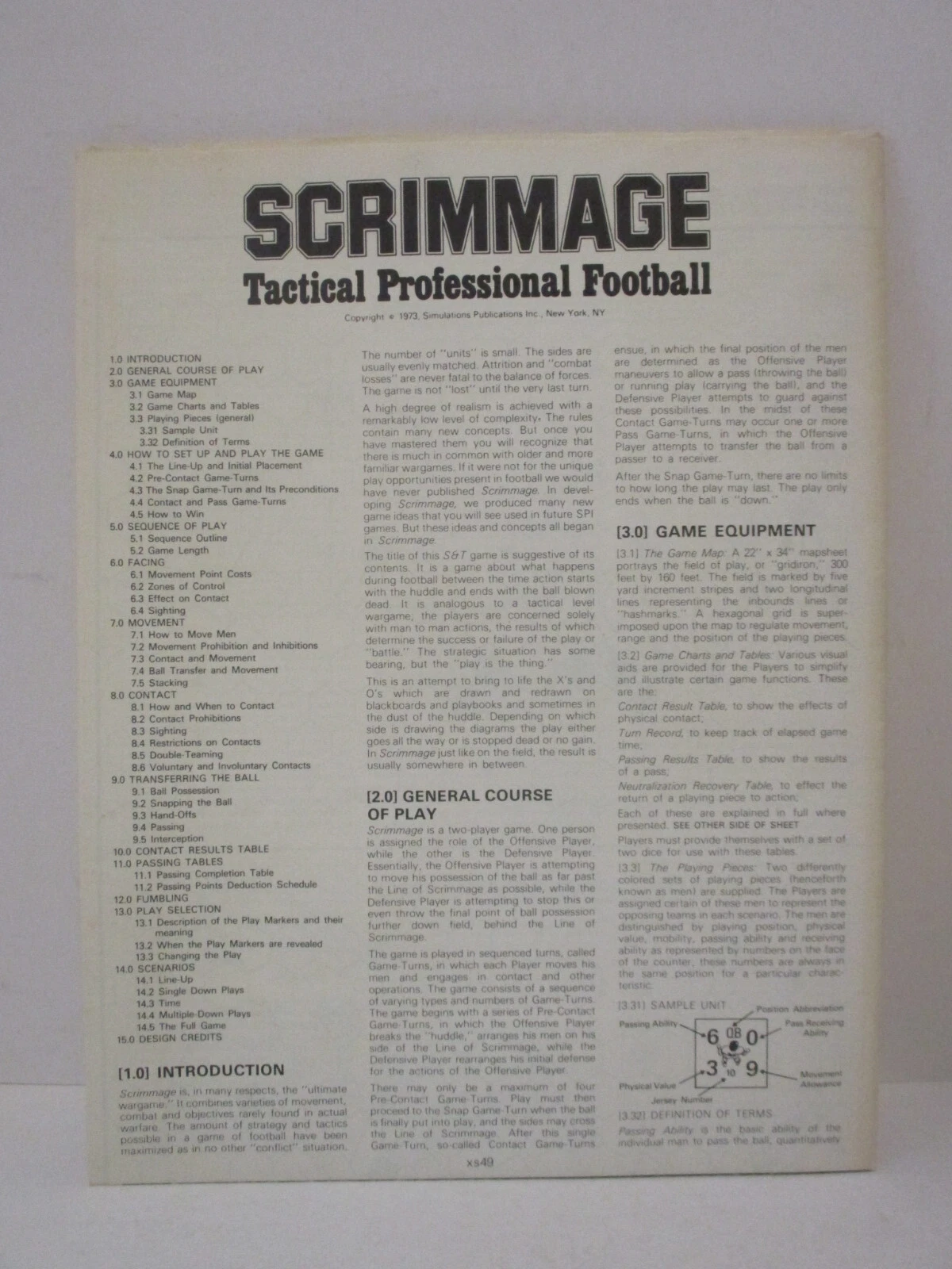 “ Scrimmage was invented by Chuck Eskridge, and David Williams. It is a football game in which one side controls the offense and the other controls the defense. Movement is accomplished by dice rolls, with slower players have lower maximum movement capability. Each side has pieces (players) of varying strength and speed. Any player can tackle any other player, but only players of equal or greater strength can block opposing players. The offense sets up, and then the defense, with a twist: the defense does not know whether the offense is running a passing play or a running play. (The choice is disclosed after the play starts.) If it is a passing play, the pass can be thrown to a designated grid but only after the play has had time to develop. If a play breaks down, the offensive player draws a card to determine whether he can recover.