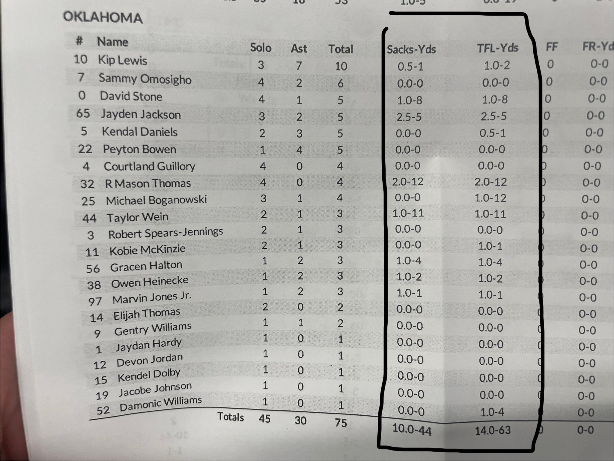 OU Guy, the defense played incredibly today, but the 14 TFL's on your stat sheet included the 10 sacks.