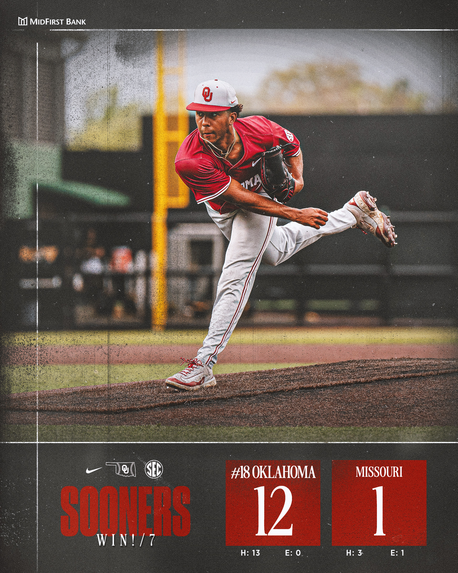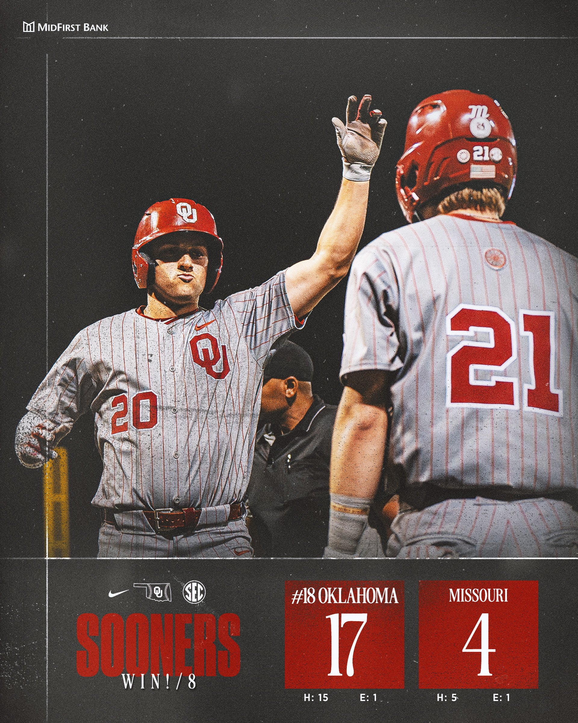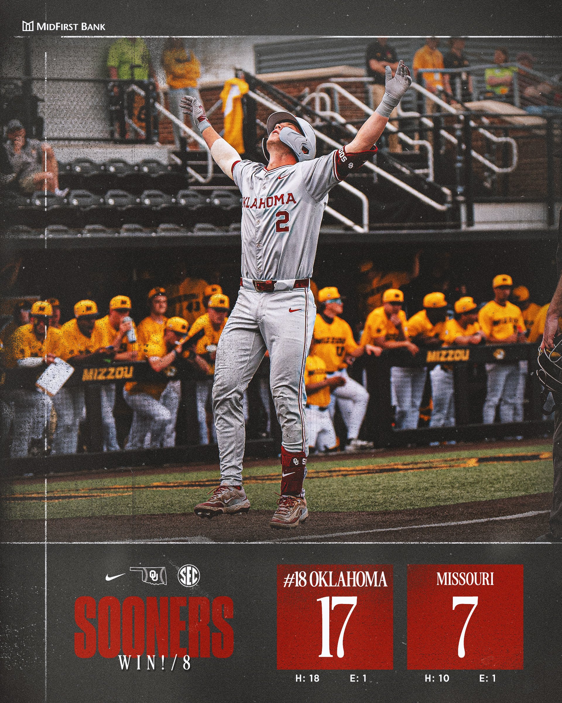 No. 18 Oklahoma (27-10, 8-8) explodes for 17 runs on their way to a dominant run-rule win over Missouri
