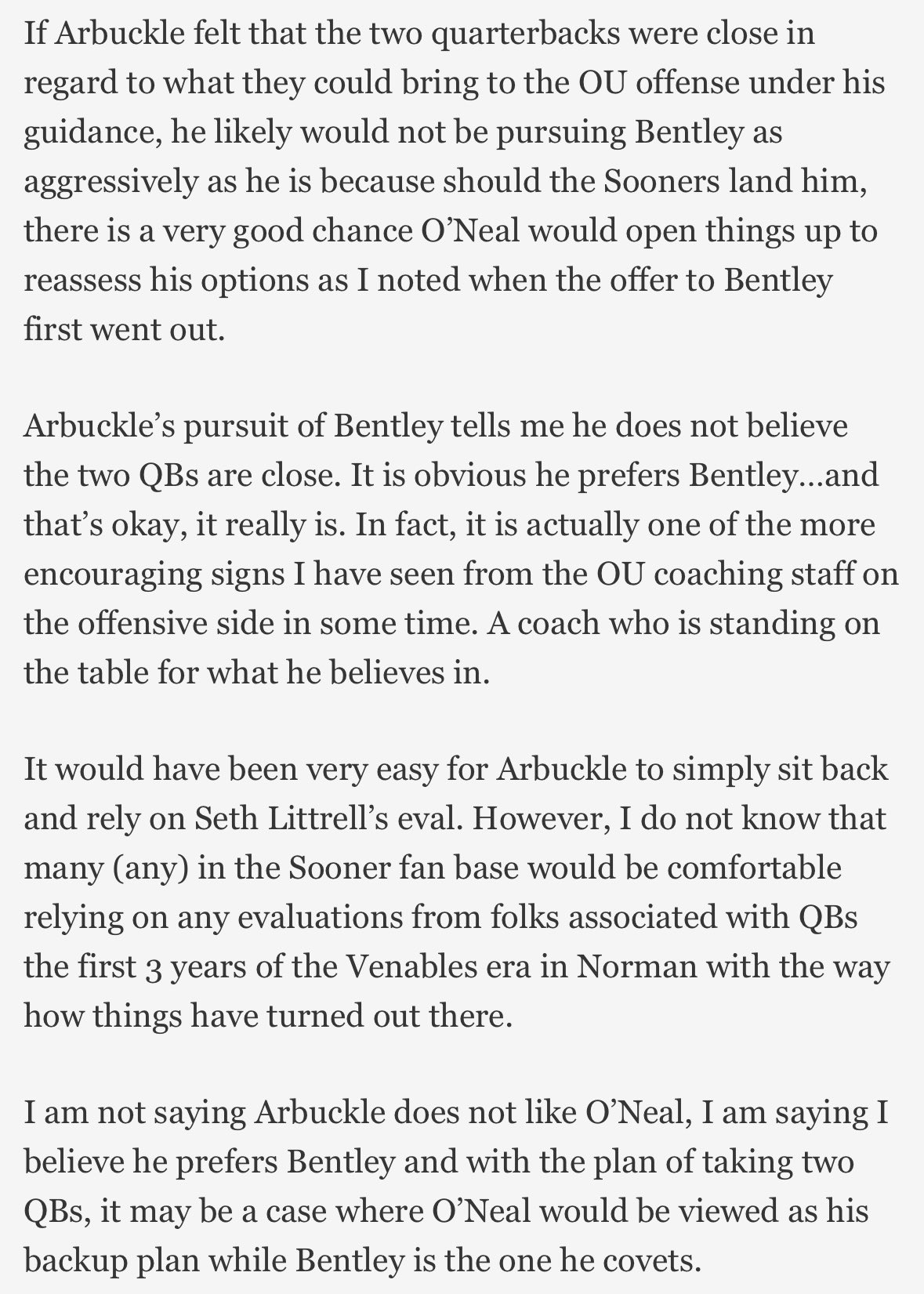 From February 27th on the TFB_Sooners Donor Board in an article titled “QB Recruiting | Standing on the Table’