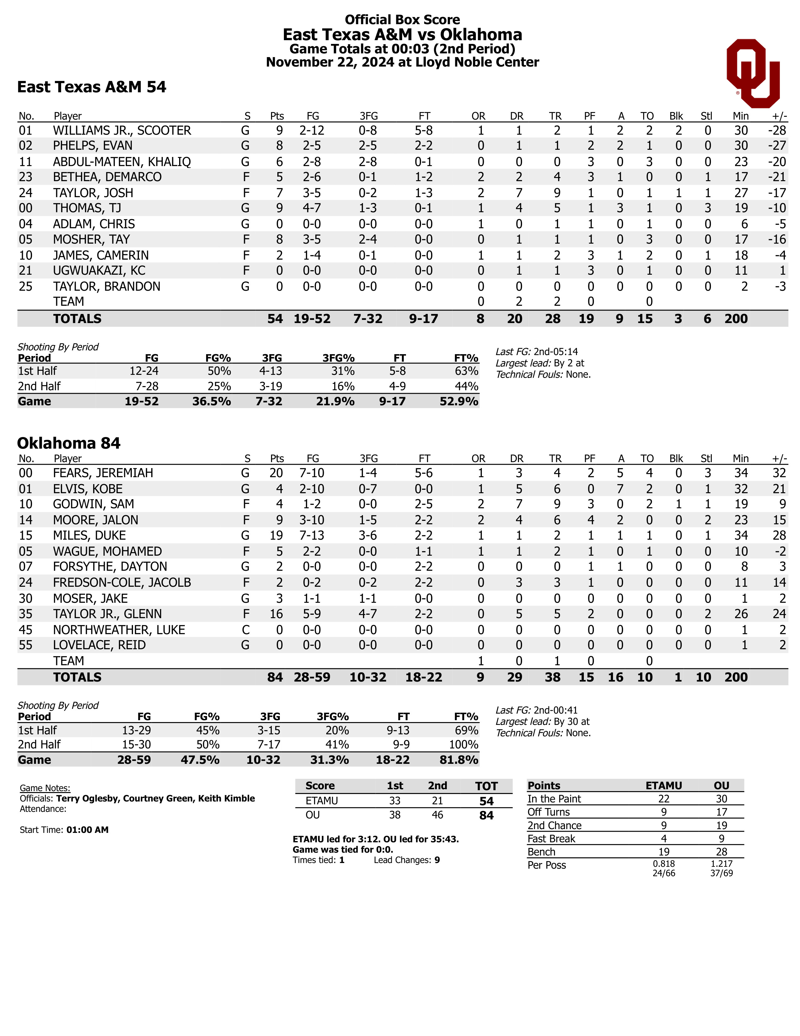 OU plays Providence (5-0) today.