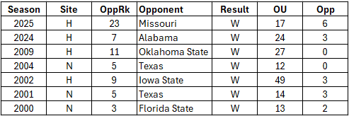 Sooners games when they held a ranked opponent to 6 points or less since 2000