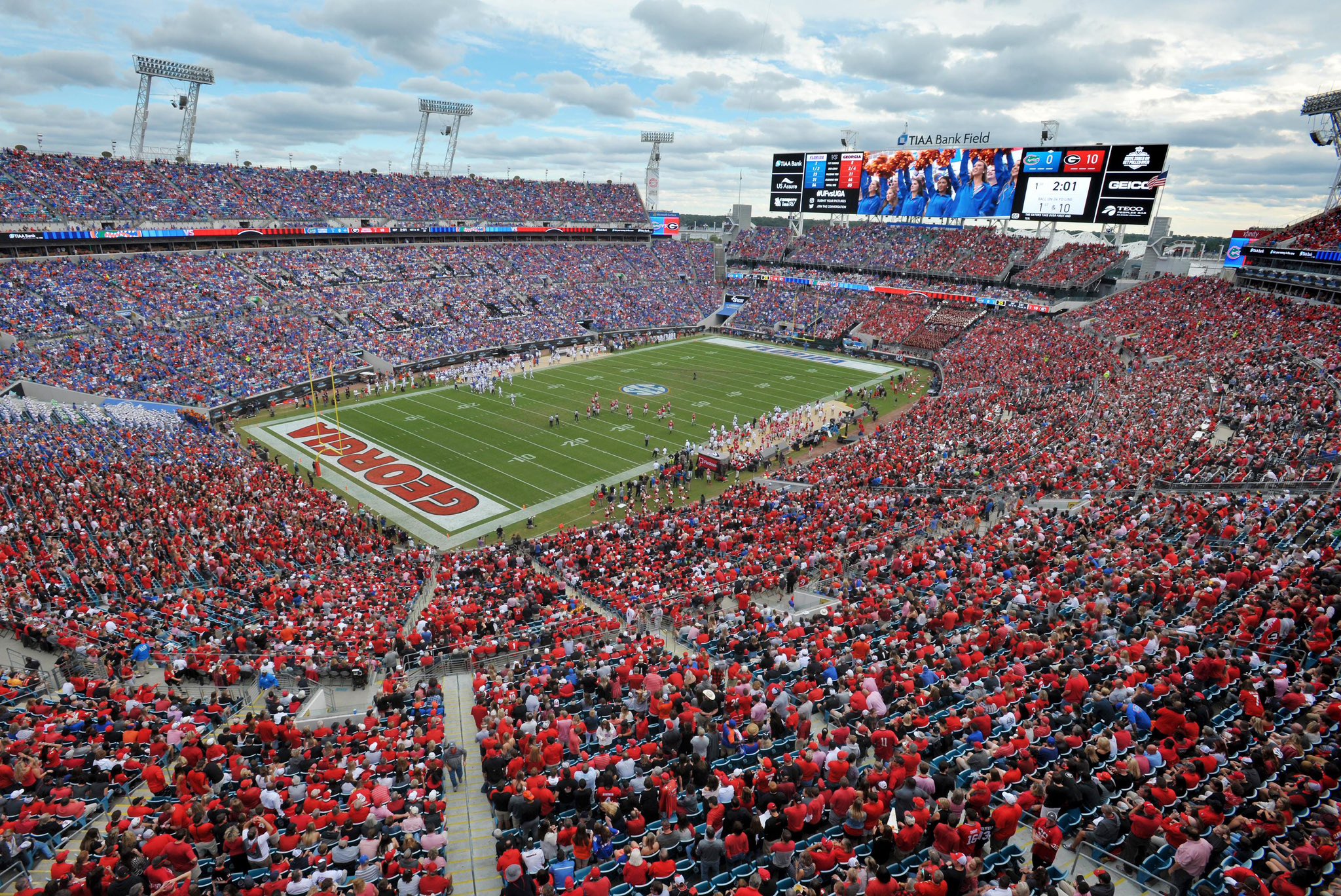 Since 1933, with only 2 exceptions, the Georgia/Florida game has been played in Jacksonville. But unlike OU/Texas, travel is not equal for both schools. Everbank Stadium in Jacksonville is 74 miles from Gainesville, but 345 miles from Athens.