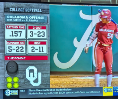 This team is in serious trouble, lost 2-1 in extra’s. Had bases loaded T7 and no runs. Had 2 on T8 and no runs. Bama walks it off B8 and wins series 2-1.