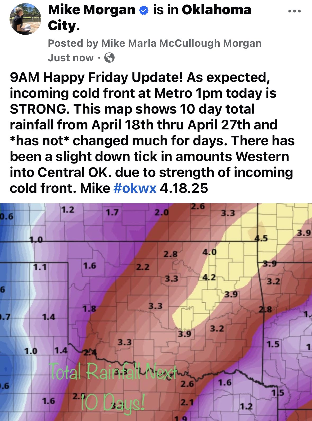 Well the rain came with a vengeance. 2 people missing in Moore after car swept in drainage ditch. Hope they survived. Tornados in the state , Ada for one.