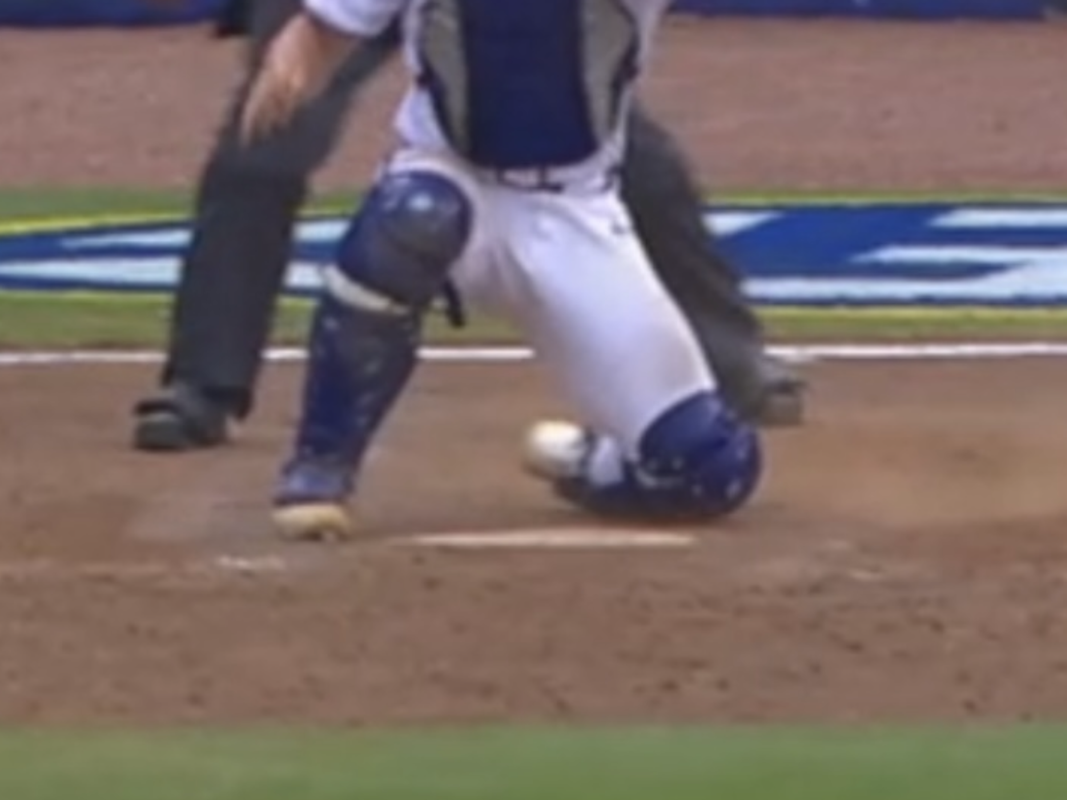 The head of umpires said on air that a catcher is allowed to have ONE foot out of the catcher’s box