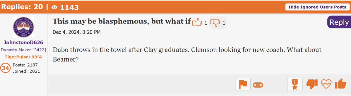 I find it amusing that Clemson fans are talking this way having been carried by pervert Deshaun Watson and Trevor Lawrence. Yes, their 15 minutes lasted too long, but it’s over. The rest of the country considers Clemson another limp-wristed ACC team. Dabo’s schtick has gotten very old. The bag man is no more. Recruiting sucks.