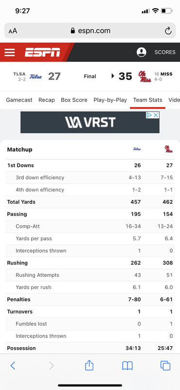 We outgained them by over 130 yards. They outgained you by over 130 yards. Pray for a lot of Ole Miss turnovers. It could happen. Young quarterback in a very hostile(great environment). Anything is possible.