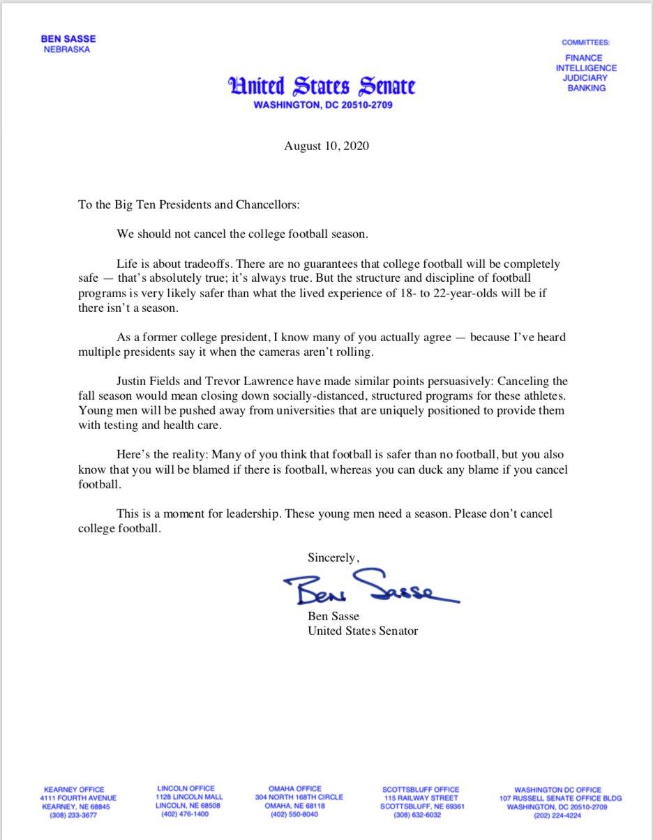 Sen. Ben Sasse (R-Neb.) has drafted a letter that he plans to send to Big Ten presidents, identifying reasons why he believes college football should be played.