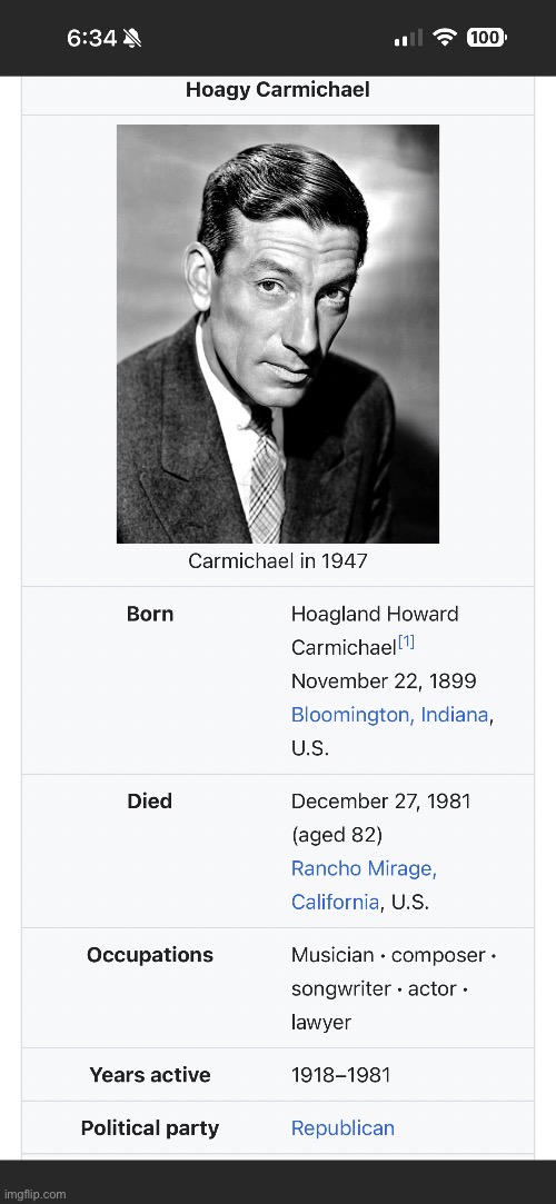 You should throw out some useless information about some famous folks from Bloomington, IN. One Hoagy Carmichael, country western singer, songwriter and composer