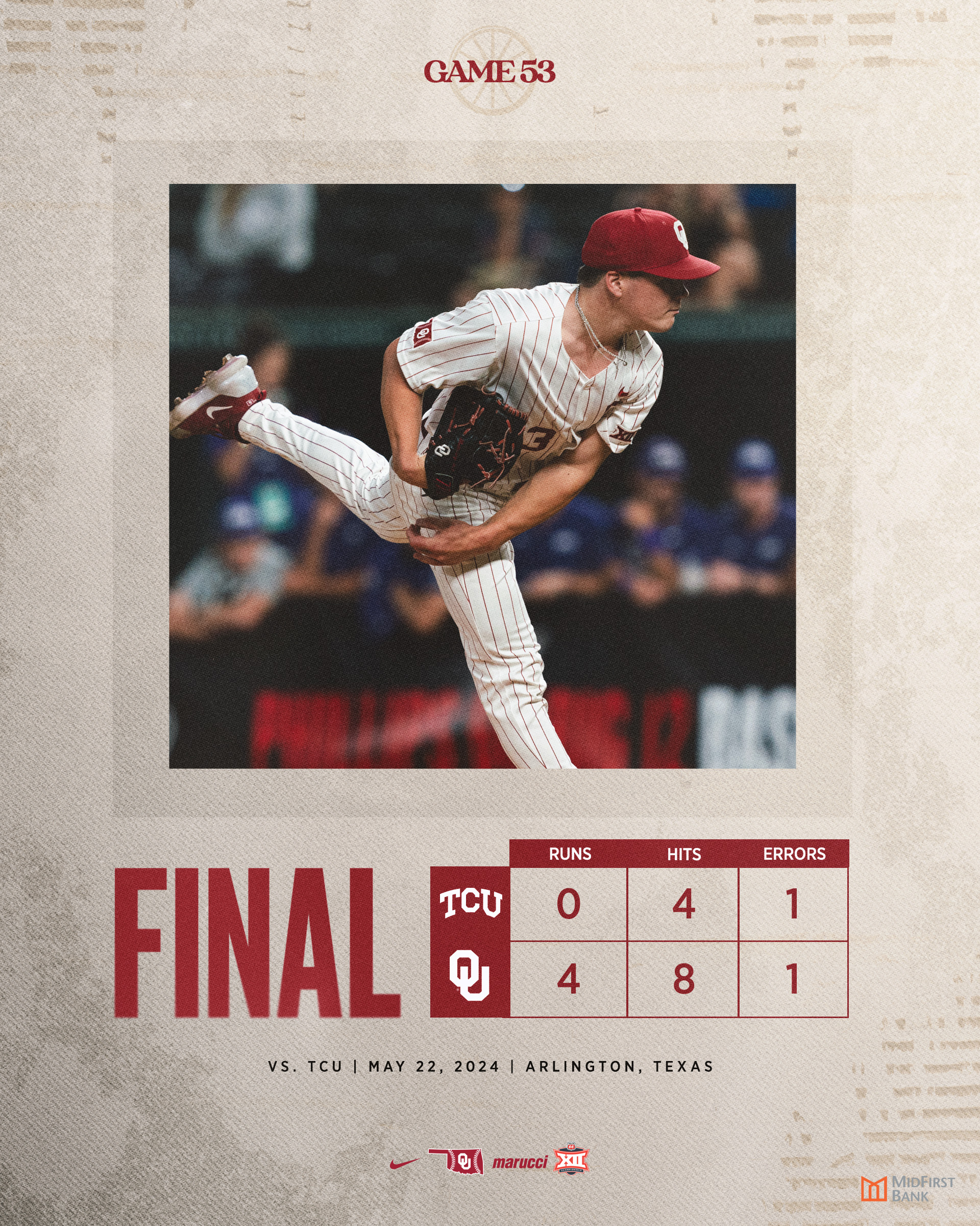 Oklahoma opens the Big 12 Tournament with 4-0 win behind a Braden Davis complete game shutout (9 ip, 4 hits, ZERO walks, 9 Ks). Sooners advance to winner’s bracket on Thursday vs. Kansas (12:30p).