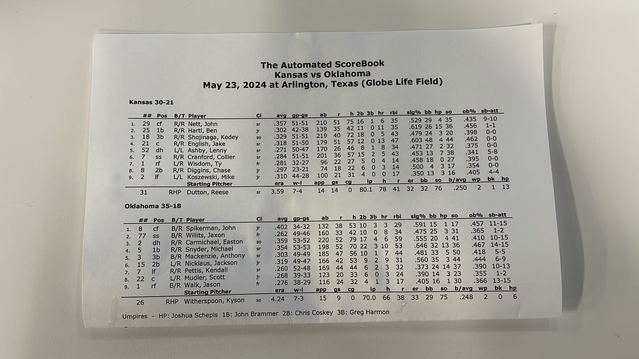 Oklahoma dinged the Big 12 Pitcher of the Year for 4 runs and 6 hits, as he's not able to quite complete 6 innings