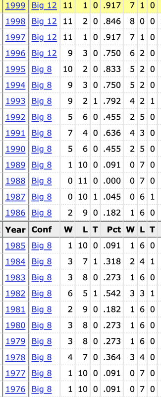 That said its Snyder and its not even close. Beyond what other posters have mentioned, Snyder won a good amount of big time games. He took out OU and Texas multiple times in prime Stoops/Brown years. And he did it with spare parts from a fricking cave.