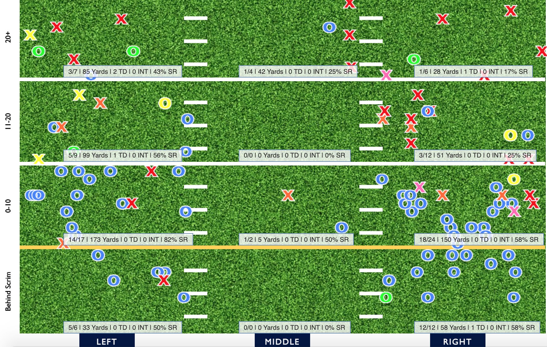 - JT Daniels has thrown 71 passes. 16 have been under 20 yards between the hashes (22.5%)