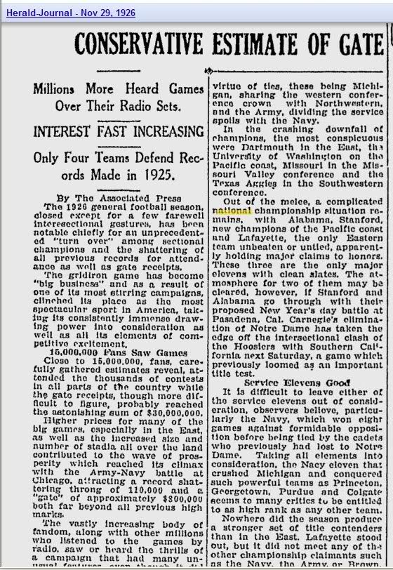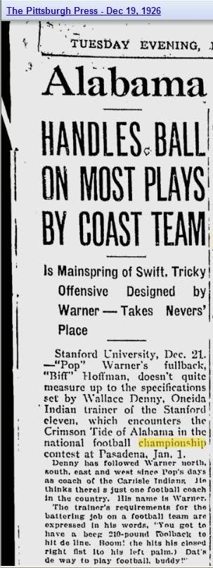 Also, setting those facts aside, Bama had the "best record" in 1925, 1930 and 1934 (tied Stanford in the 26 Rose Bowl) and won the only bowl game that existed. So don't contradict yourself here by saying these are "illegitimate" when you use "better record" as the criteria in your other arguments...