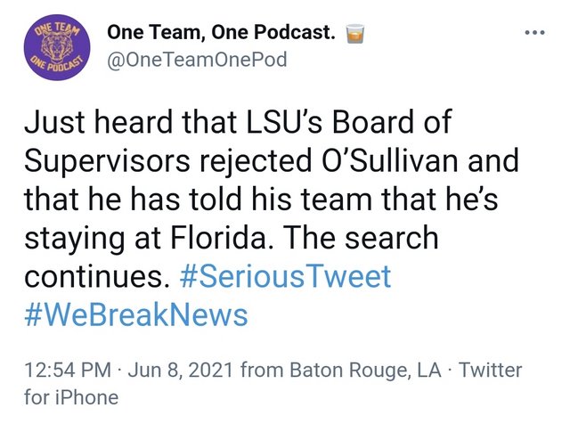 O’Sullivan is supposedly dating the lady whose husband recently killed their two children and himself. Article: LINK: What we know (and don't know) about apparent murder-suicide of two Florida boys and their dad If true that O’Sullivan and the woman are/were dating, I’d imagine LSU wants nothing to do with that given its own current PR issues.