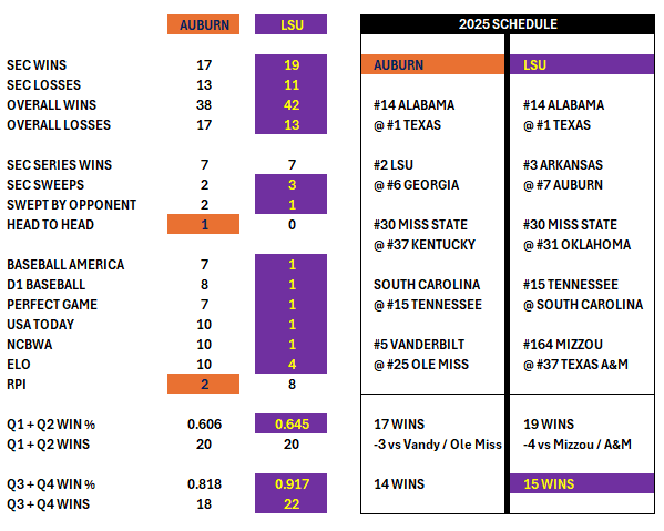 Exactly. He also highlights in purple the number of Quad 3 and 4 wins as if that’s some sort of accomplishment. He cleverly combines the number of Q1 and Q2 wins to show a tie and avoid showing Auburn has 2 more Quad 1 wins. He leaves out SOS all together as a category. And on the right side, it would make far more sense to switch out the placement of the Georgia and Vandy series under the Auburn column which would result in 16 wins for Auburn to 15 for LSU, but that would make Auburn look better so he switched those two out.