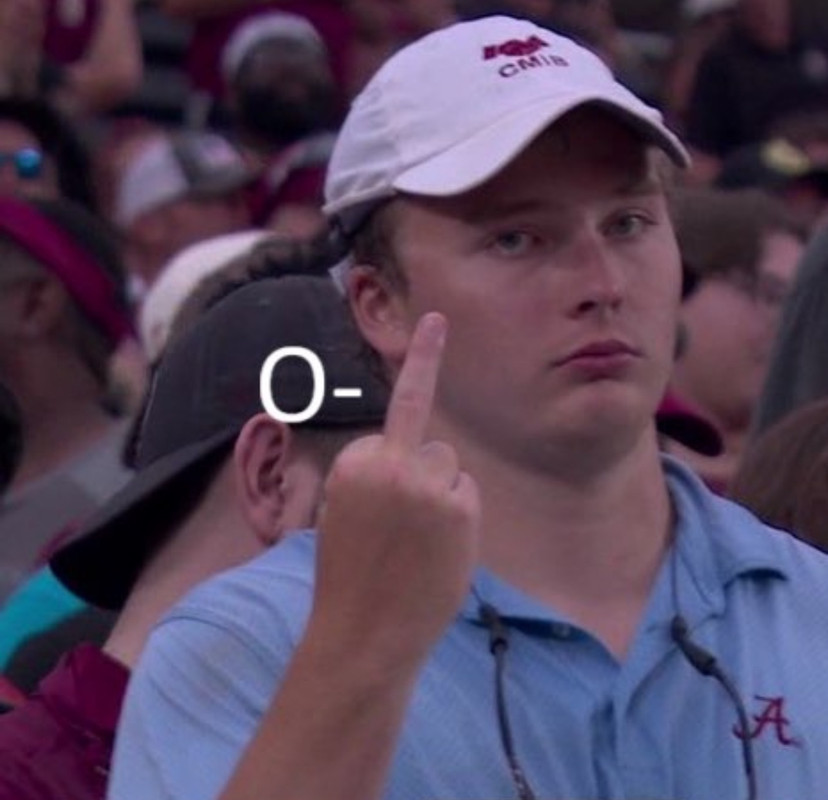 Why hasn’t the Bama fan giving the camera the finger a GIF yet? That has meme and permanent fixture in the Rant GIF lexicon all over it