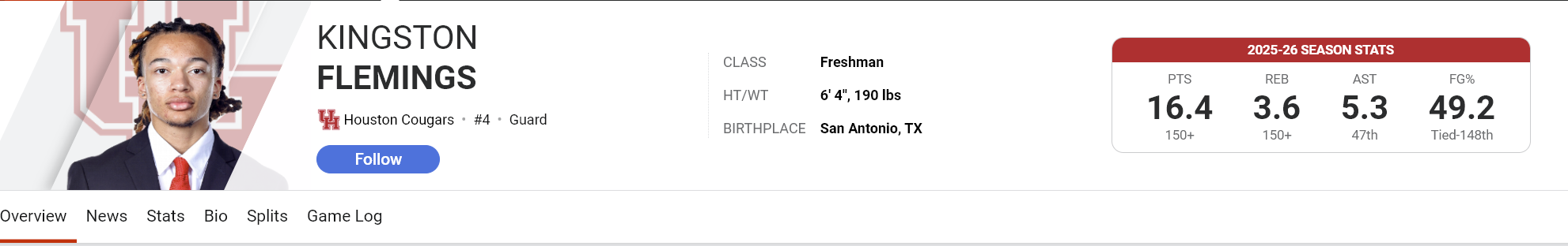 Flemings was extremely impressive against us. And Flemings has better PER, better win shares and win shares per 40 mins, as well as box plus/minus. Acuff scores more points due to being a high usage player, but he falls behind defensively as Flemings is a top notch defender. Flemings is also projected to go higher in the draft on most all mocks I've seen.