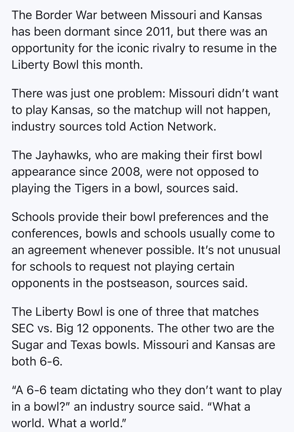 The only bowl that fit the criteria with SEC tie in was Las Vegas Bowl and Birmingham. Birmingham is after Christmas, and the request was for players and coaches to be home for Christmas. Las Vegas Bowl is not selecting Mizzou, so the next bowl that fit the criteria Gasparilla bowl. Since the Gasparilla is not first choice for SEC, Liberty Bowl came back and asked Mizzou if they were willing to budge on the date if the opponent was ku. Mizzou said no sticking with their original bowl criteria.