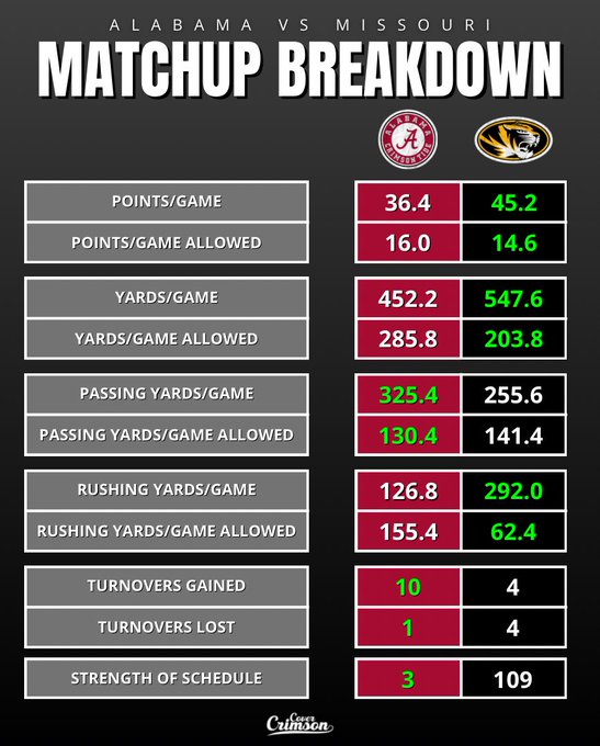 As a Mizzou fan, Mizzou can't make mistakes or it can snowball. We saw it in the kansas game and South Carolina where a turnover led to them being down. Mizzou was able to stay the course vs those teams and win by 2 scores. I don't see that being the case vs this Bama team. I think Mizzou can win the game. They can do it without even playing a perfect game. But I Alabama's strengths I think end up overwhelming Mizzou's weaknesses.