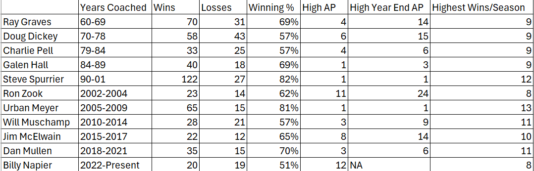 Also, I know everyone says UF football didn't start until 1990, but we aren't far off from the arbitrary statistical cut offs you posted. And that is with our current coach who is the worst of the bunch.