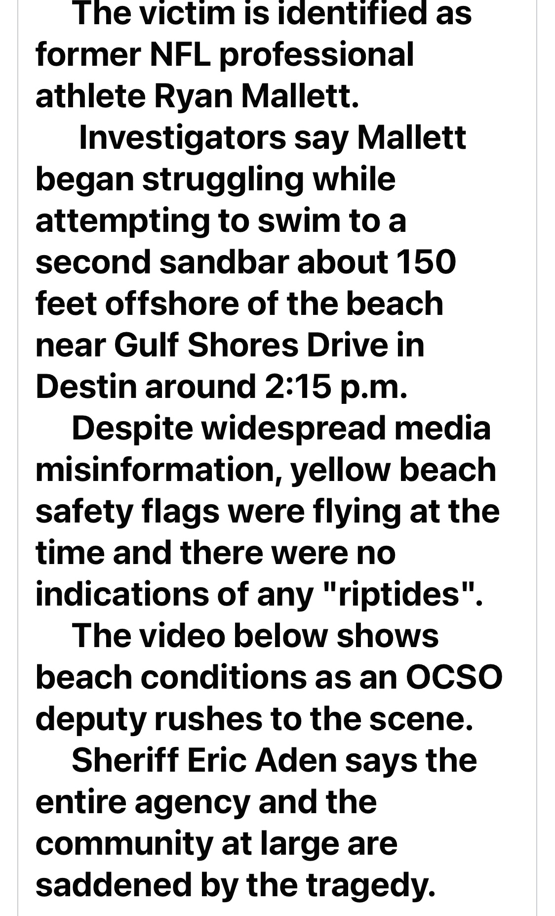 Destin Fire Control District published a statement saying "[t]here were no rip currents present in the area in which we responded to Ryan Mallett."