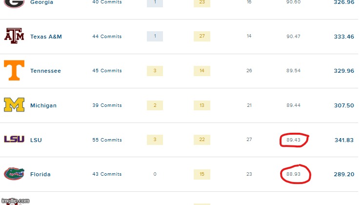 GATORS only One Spot behind LSU (average recruit ranking). Will we pass them?