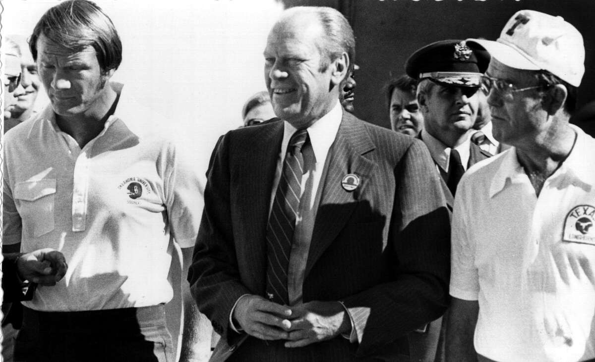 I was there that day when the three guys in this pic walked onto the field of a full Cotton Bowl. It was deathly quiet in the stadium and none of the three even acknowledged each other until someone from the Oklahoma side yelled out, "Who's that a-hole between Switzer and Royal?"