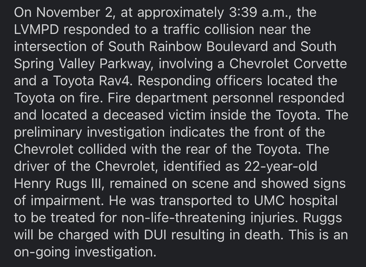 ESPN reporting that he hit a Rav 4 and one person in the Rav 4 died. Also said that Ruggs was not seriously injured.