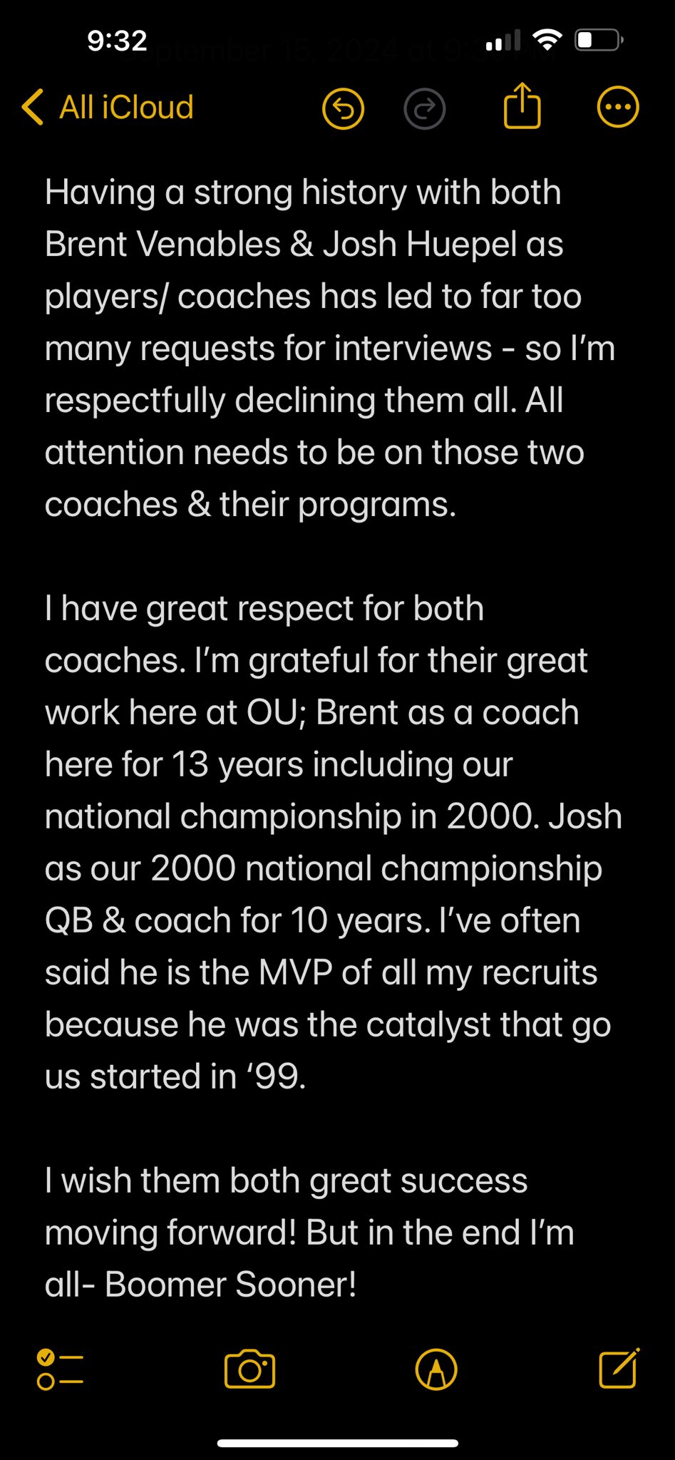 From Bob Stoops, in case anyone asks why he’s quiet this week: