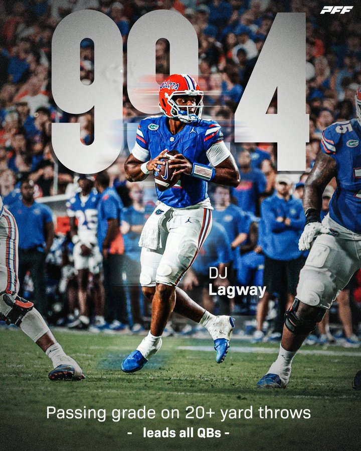 Yep Lagway is the best in the country at 20+ yard throws apparently but he will have to avoid that good pass rush.
