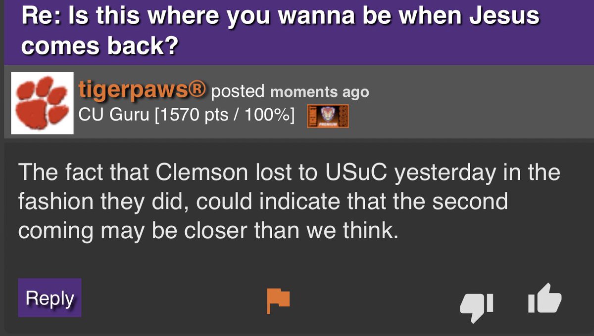 My nephew, a Clemson grad, said there were two Clemson Tigernet posters so upset with one's bashing of Dabo that they were exchanging cell numbers to meet up and fight after the game.