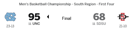 BTW, North Carolina vs San Diego State should be similarly entertaining later this evening.