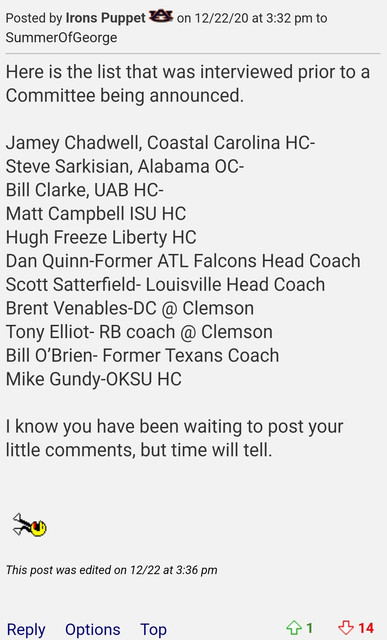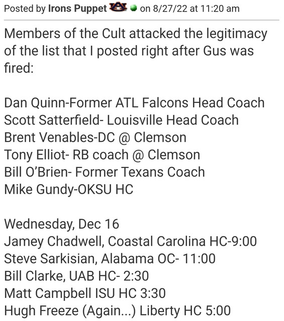Hey Dumbass, when was that list first published? I'll help you out, but you are still a dumbass. That list was posted the Tuesday after Gus was fired. Those interviews where for Tuesday and Wednesday. There was more people talked to beyond Wednesday . Then Gogue gave sole authority to Greene who chose Harsin. You still try to deny everything and use your Auburn username to try and get info. What a frick up. Lolololol