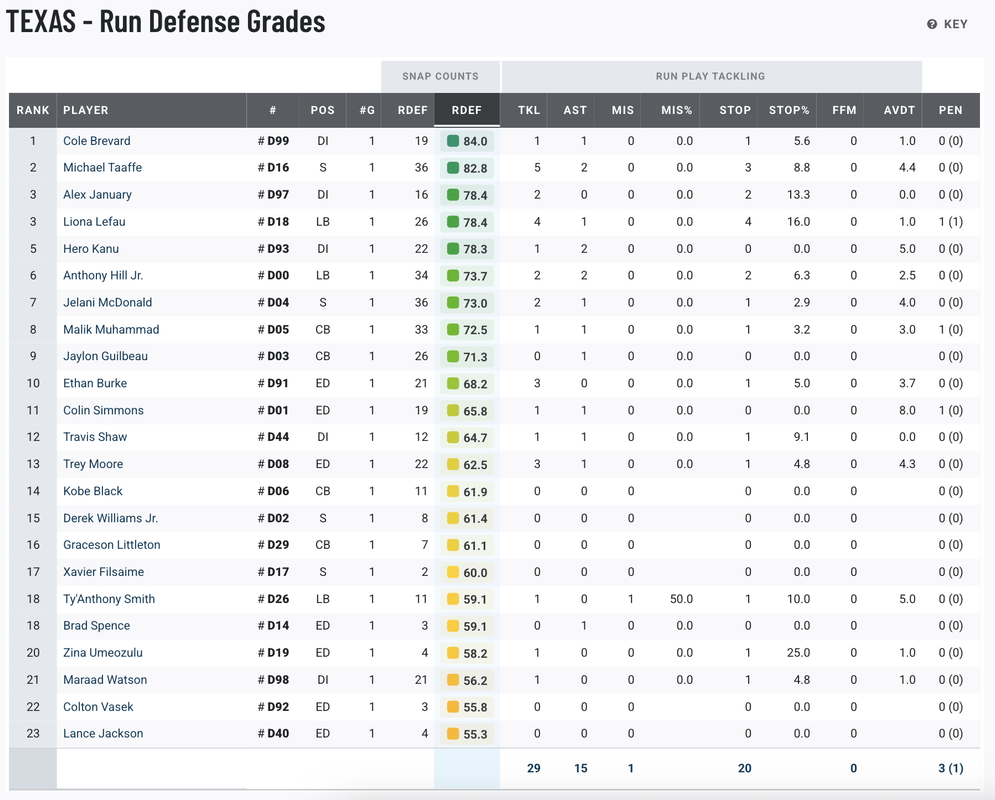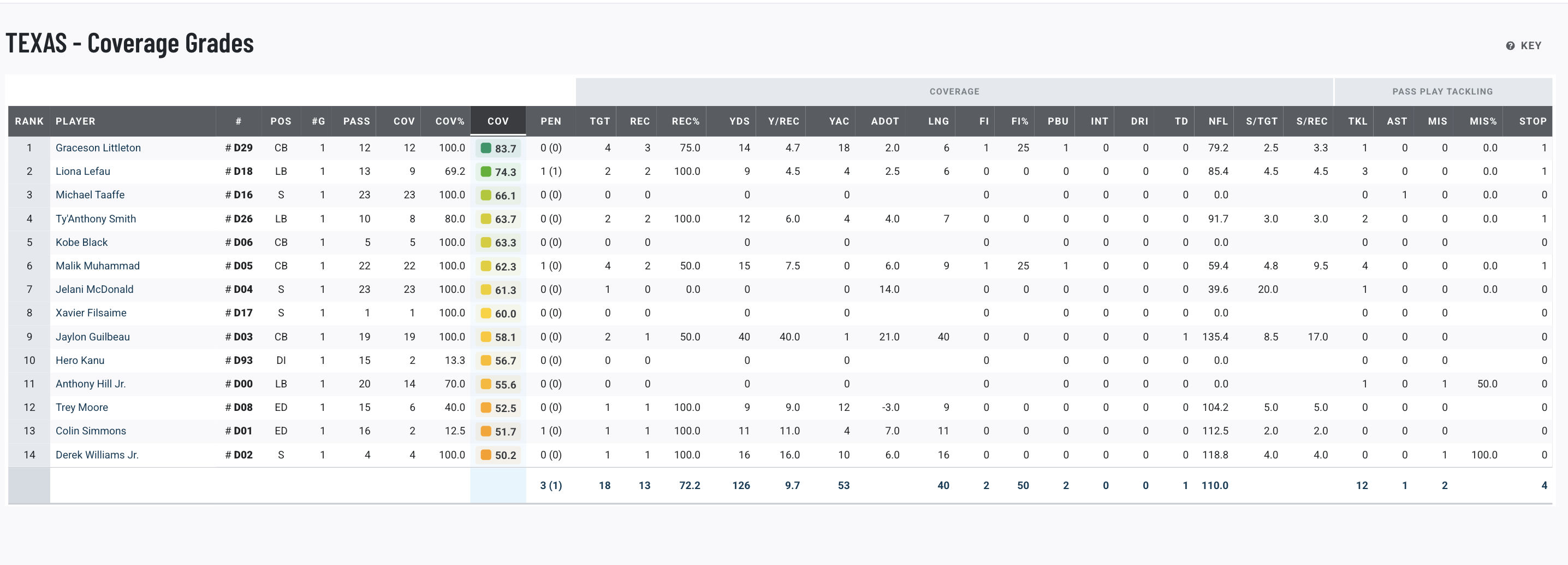 Littleton graded well, but he got targeted on some quick hits. 4 targets in 12 pass snaps, but almost every throw Sayin made was within 10 yards of the LOS. If you exclude the jumpball to Tate, ADOT was 4.4 which is laughably conservative