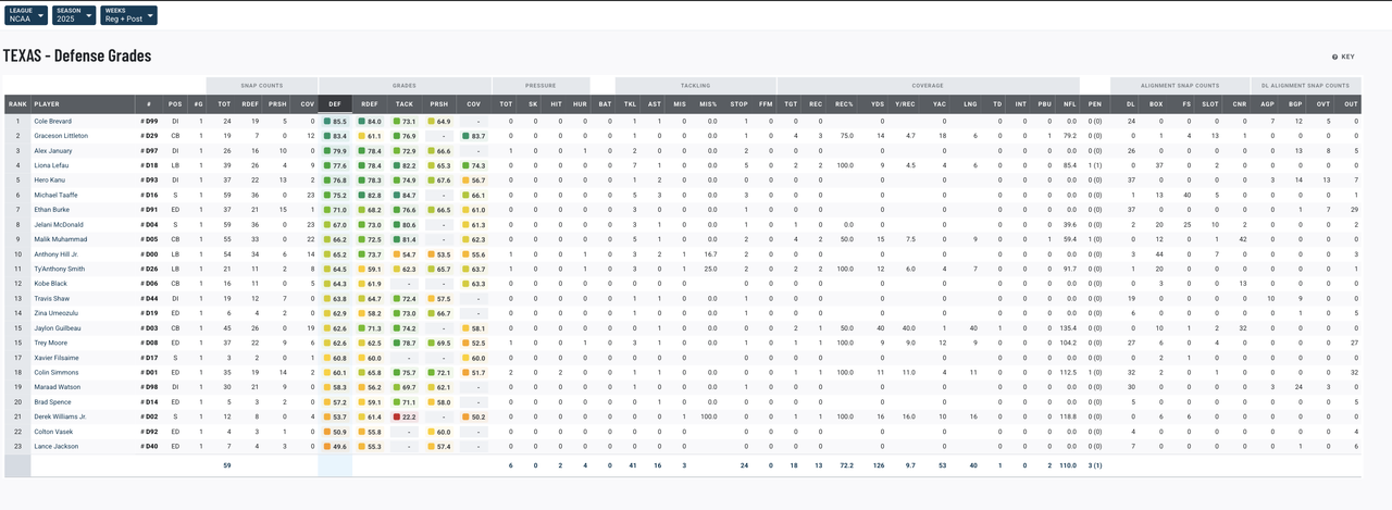 Arch grades about like you would expect. His elite throw% was an ungodly 13.3%, only player higher was Cal's qb who looked like the 2nd coming of Steve Young, and double what most 1st round qb's average. But his turnover worthy plays were also double what you would expect at 5.9% as Downs overran a chance at a 2nd pick after jumping coverage