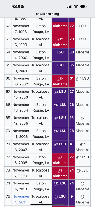 LSU has lost the last two by a combined score of 62-22. LSU is 2-13 the last 15. If LSU wins 30 in a row they still will be below .500 in the series. LSU has only beaten Alabama 27 times in the 132 year history of LSU football. Lane Kiffin is 0-5 against Alabama.