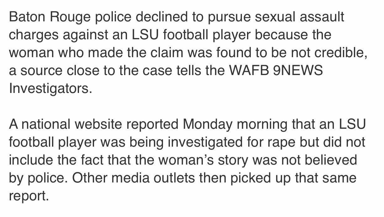 Baton Rouge Police stated the player is not under investigation for rape despite the story.