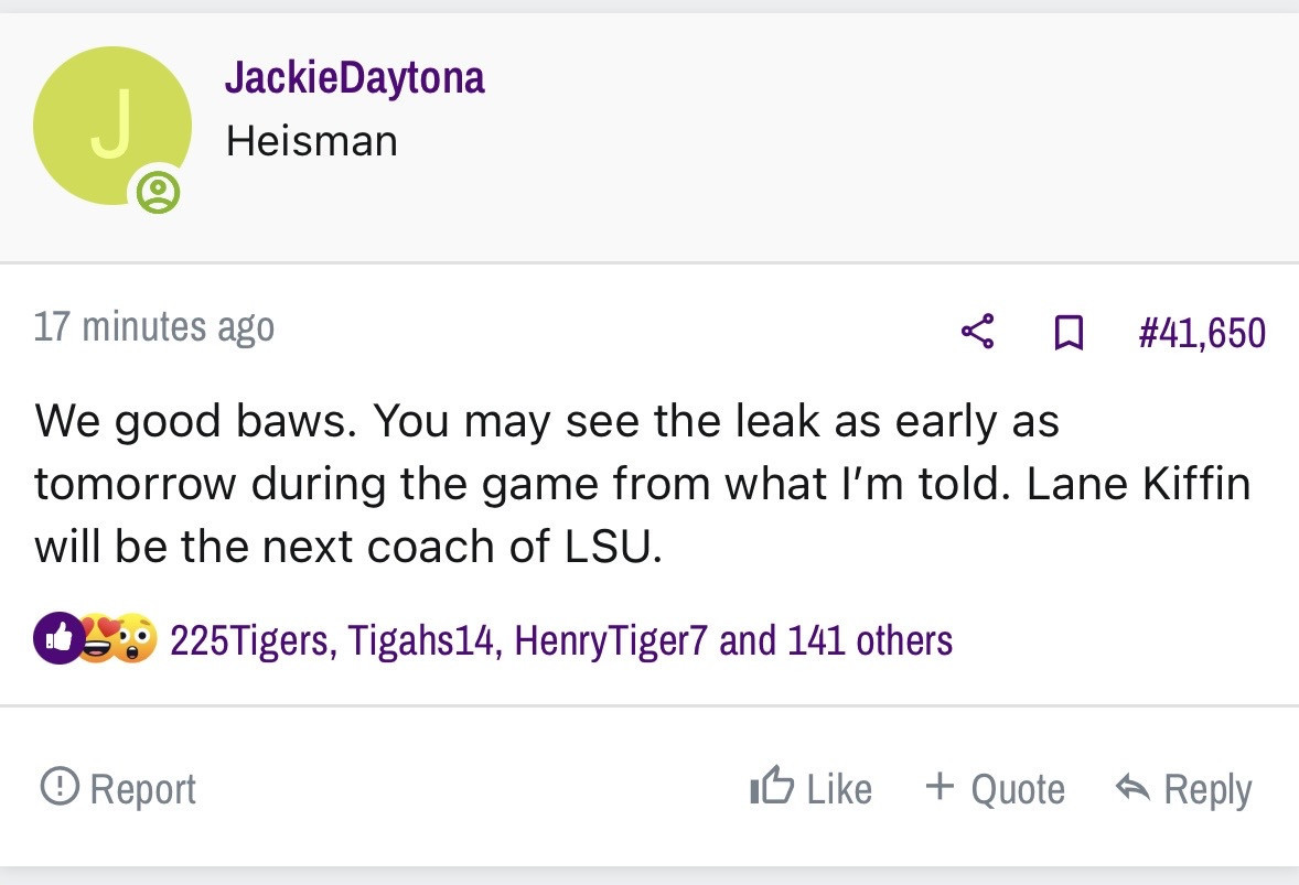 I would not be surprised if we don't hear anything this weekend. I think more and more will continue to smoke and leak in LSUs direction, but I think Lane's plan/goal is to continue to coach this Ole Miss team into the playoffs.